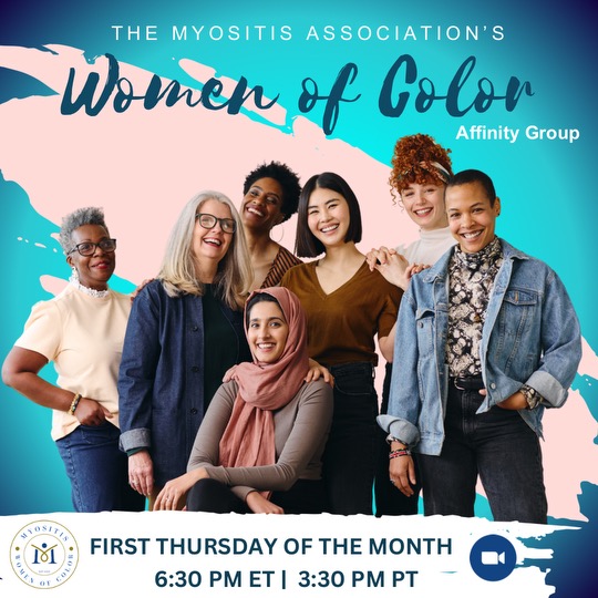 Organized in 2019, TMA Women of Color (WOC) Affinity Group is a support and advocacy group that promotes awareness through the 3E’s: Encouragement, Education, and Empowerment. They educate women and communities of color about the different forms of myositis and discuss issues specific to this population. Through workshops and support meetings, WOC will be empowered to go into their communities and bring awareness about myositis. Meets on the first Thursday of most months at 6:30 PM ET | 5:30 PM CT | 4:30 PM MT | 3:30 PM PT. Register here.